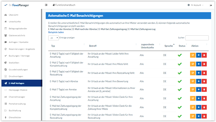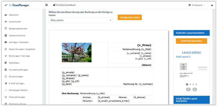 - Druckt und versendet Dokumente für Angebote, Rechnungen, Mahnungen, Stornierungen, Ankunft mit Schlüsselcode, Bewertungen, Reinigungspläne